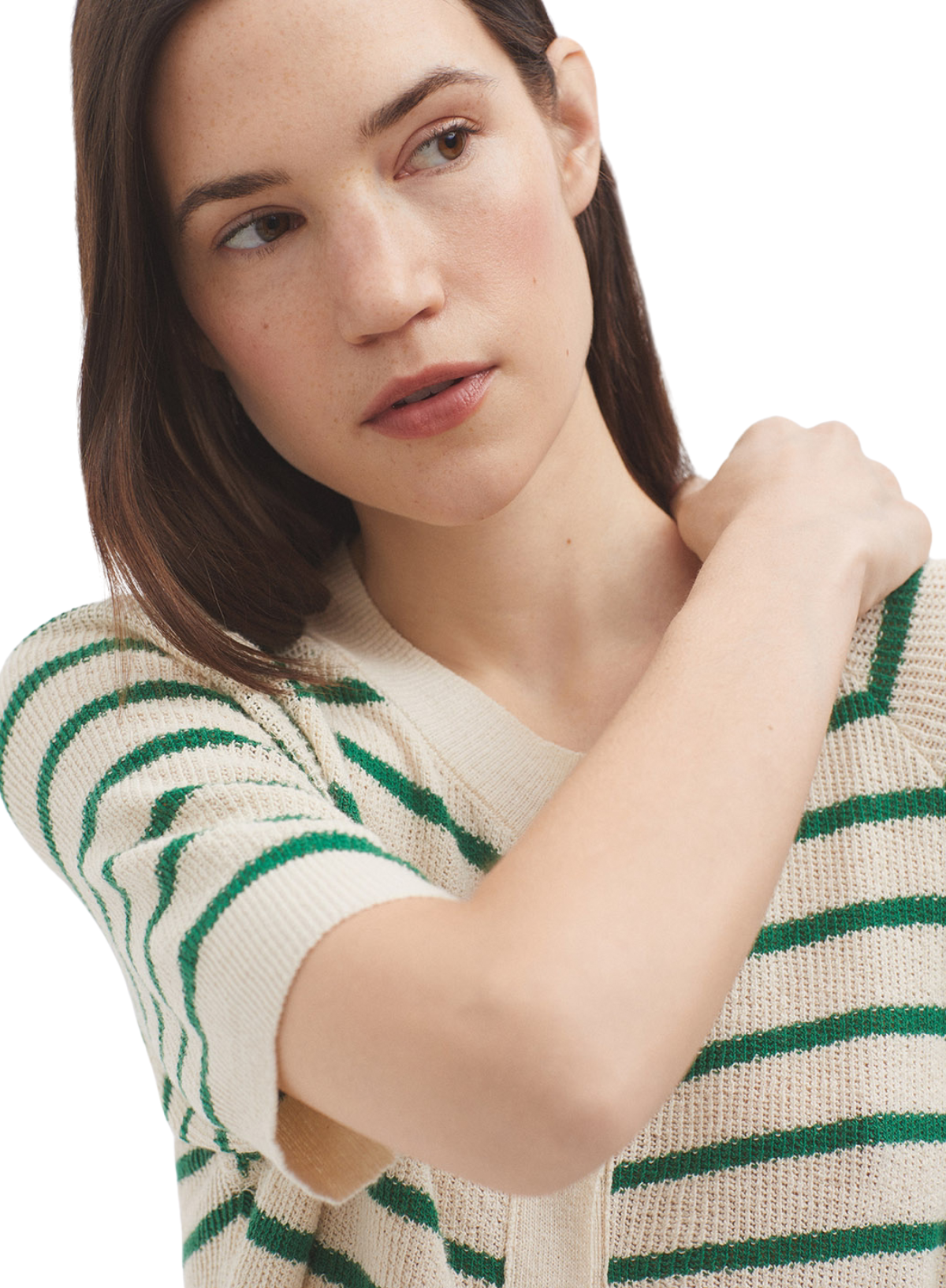 Striped BCI cotton cardigan. Round neck and short sleeves. Ribbed finish. Made in Spain.