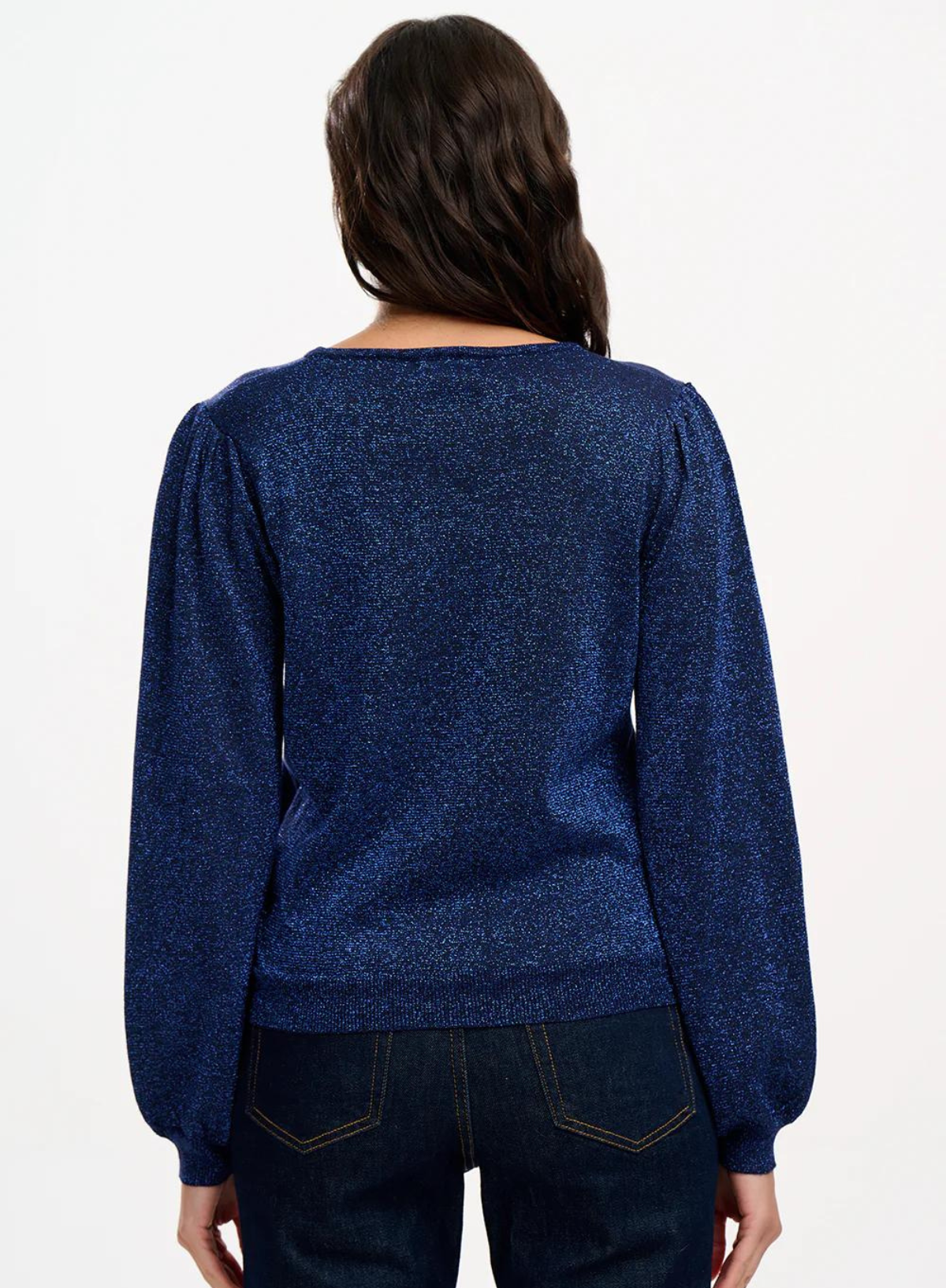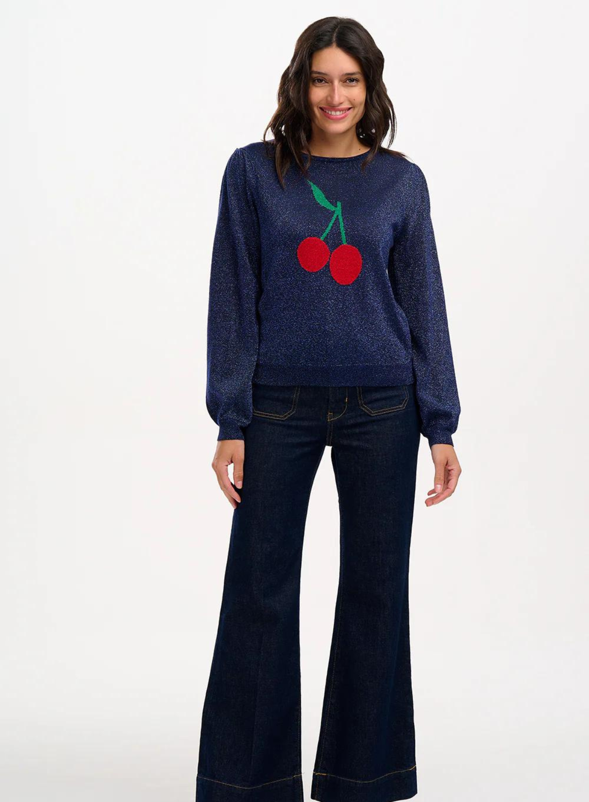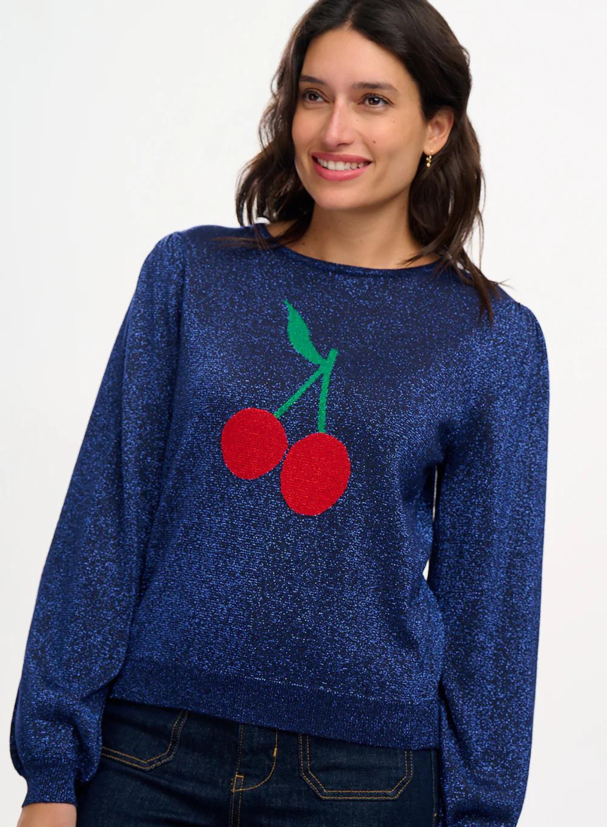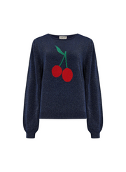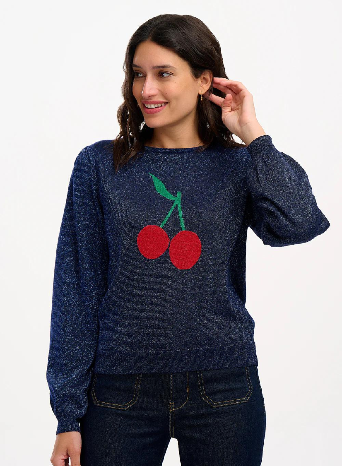 The Tiff combines the semi-fitted shape and sparkle-infused, lightweight, cotton-mix composition of our Astrid jumper with statement blouson sleeves. This design features a large playful cherry motif on a sparkly navy base.
