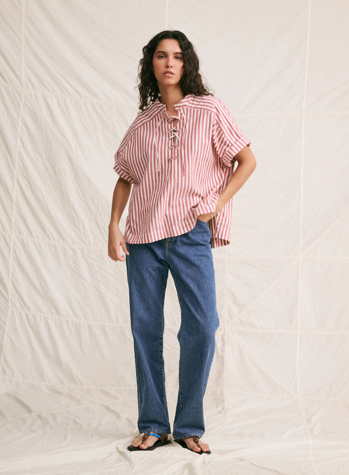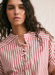 Made from soft cotton, this blouse offers breathability and ease for everyday wear. Its vibrant sangria stripe pattern adds a touch of colour and personality, making it a versatile piece that pairs well with both casual and dressier outfits.