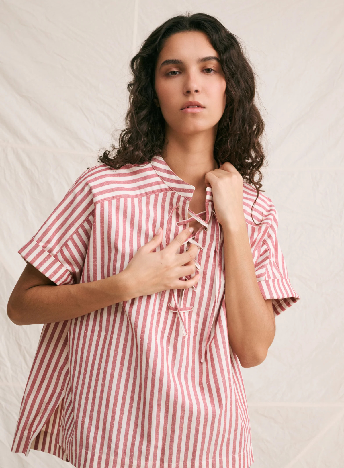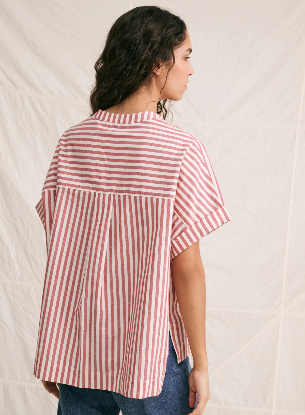 The Leo Top in Sangria Stripe from Hod is a charming short-sleeved blouse designed for comfort and style.