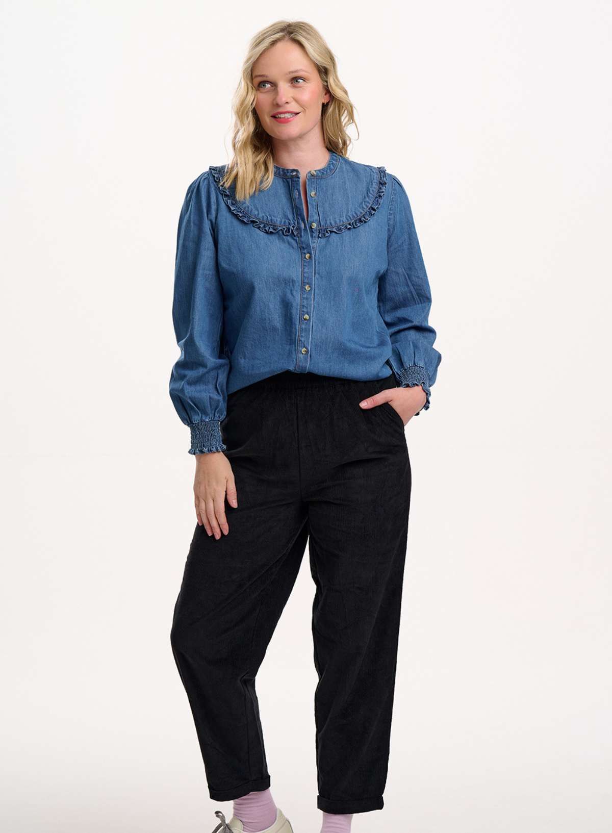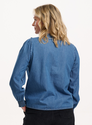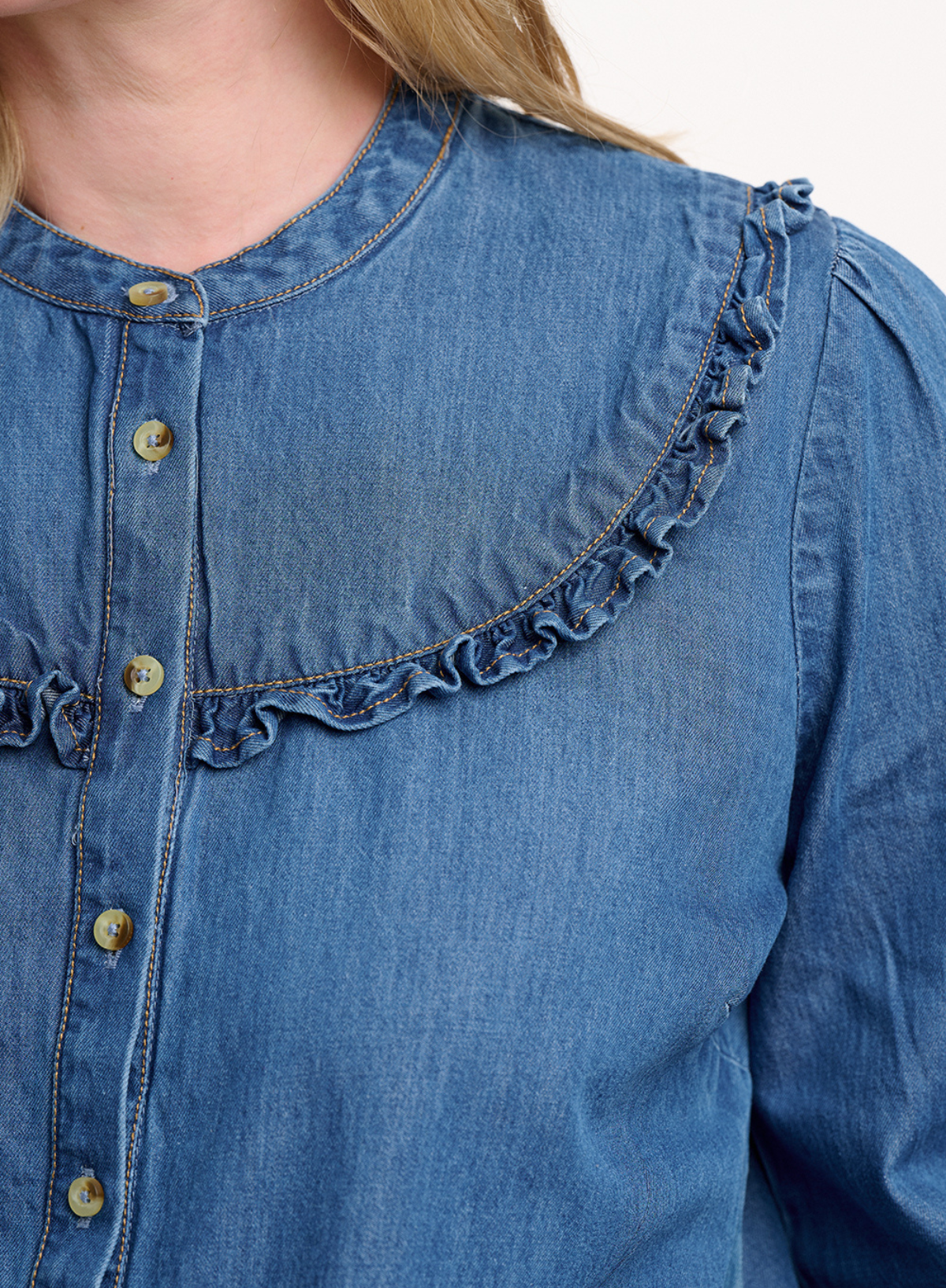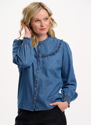 Crafted from soft mid-wash denim, this button-down blouse features a vintage-inspired frill panel front, elevated with a neat round neckline.