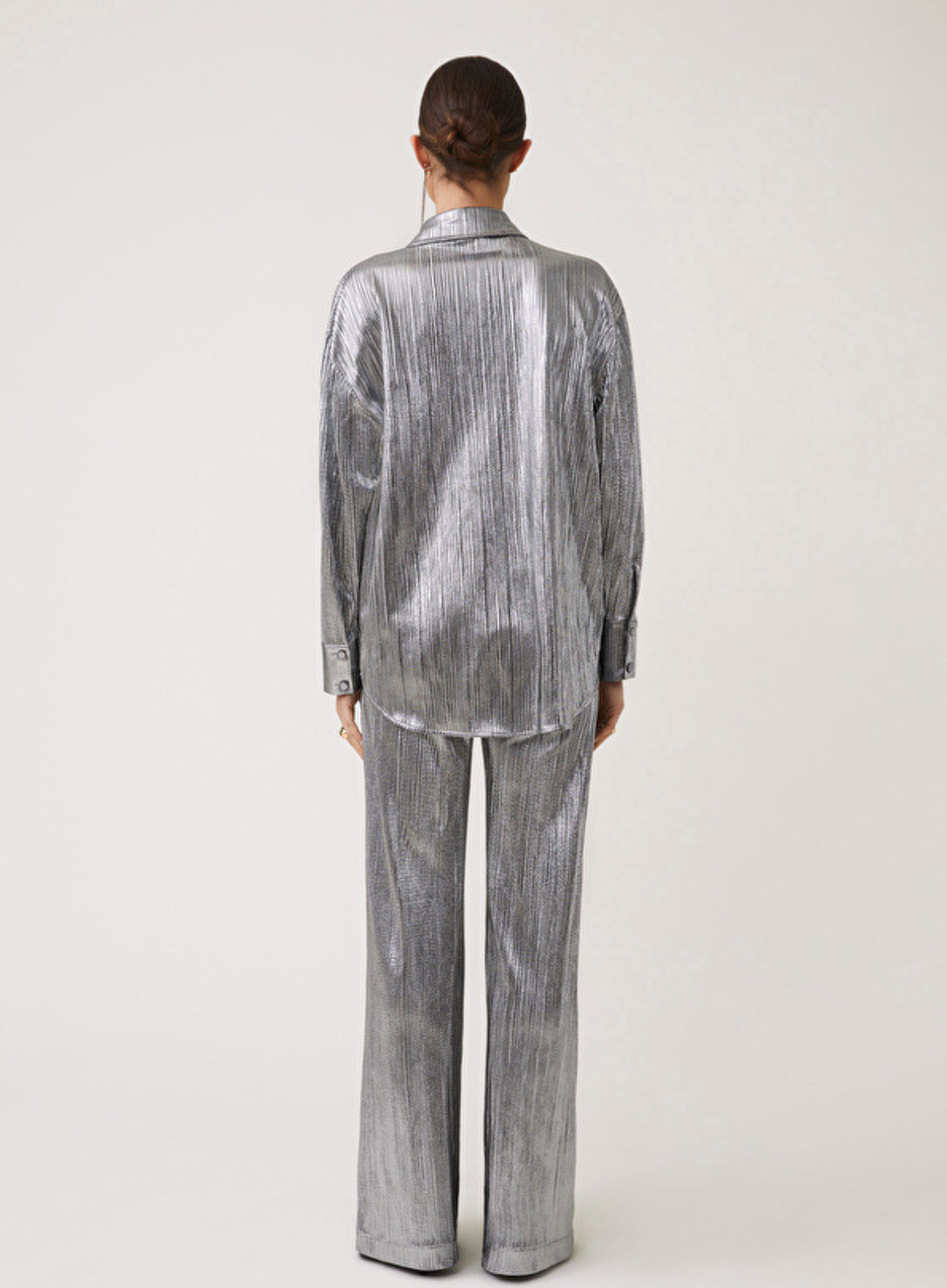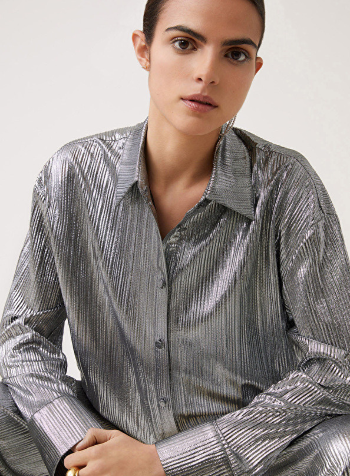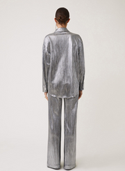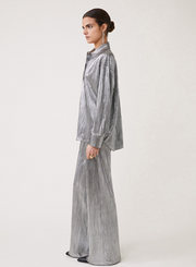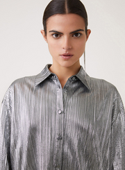 Metallic pleated blouse with long sleeves, buttoned closure.
