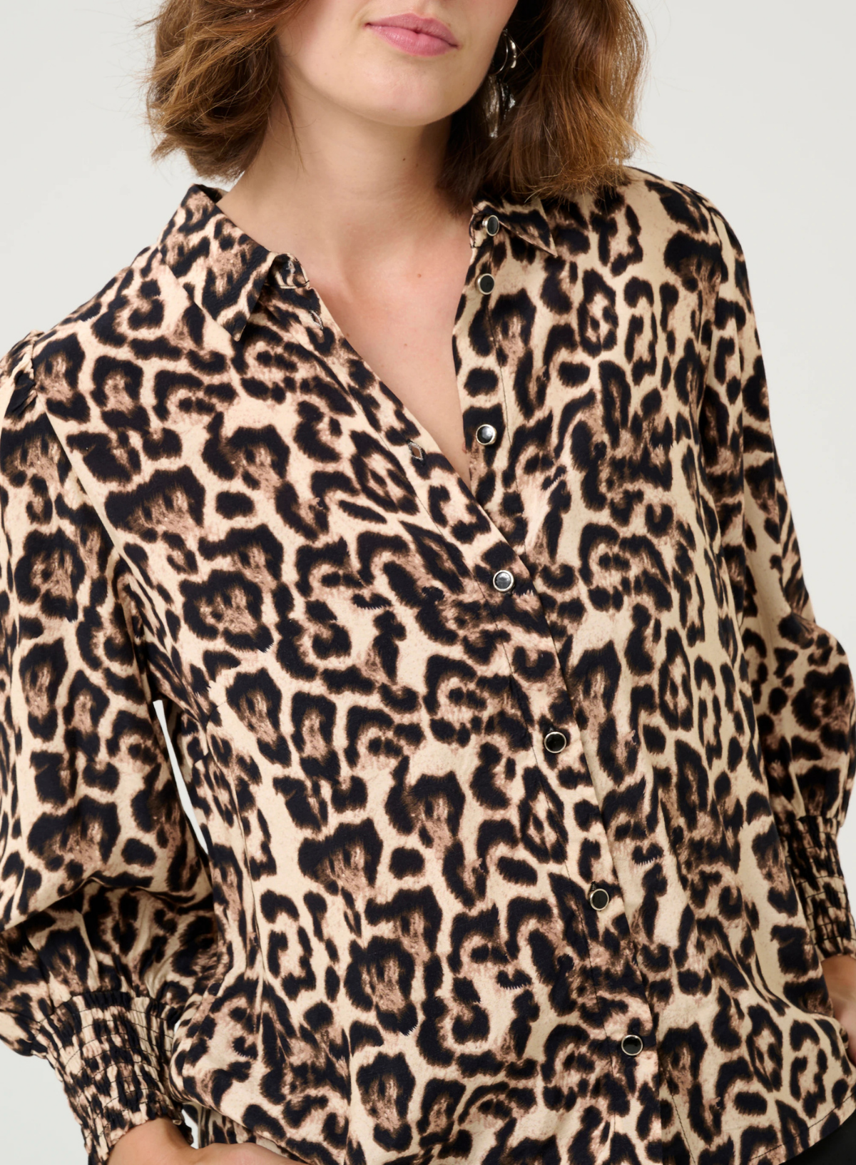 The button front and shirred sleeves add just the right amount of detail to make you stand out from the crowd. Don't wait, go wild in this naturel leopard print top! (Rawr!)