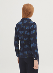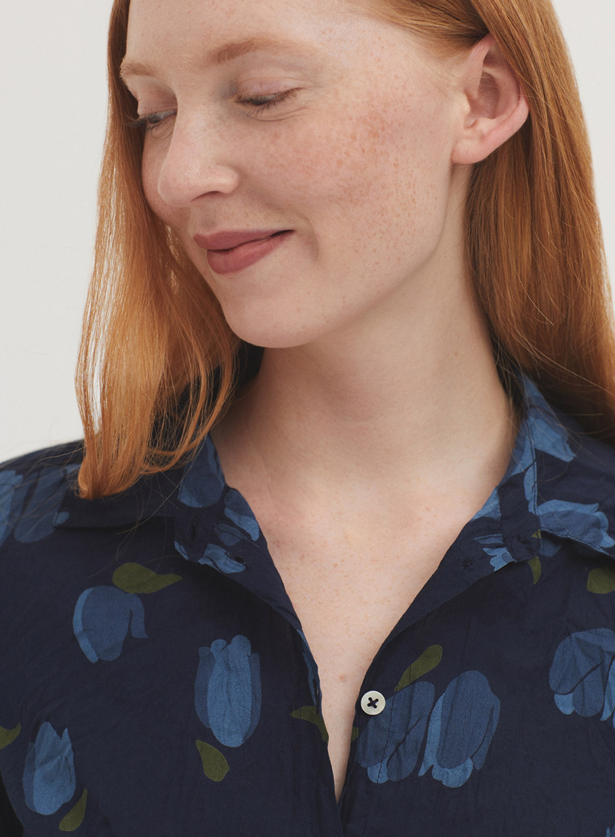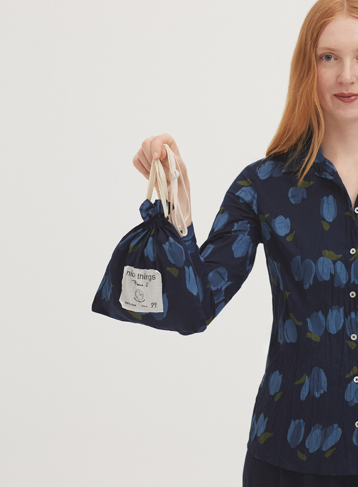 #99 basic shirt with Tulips print in sustainable crinkle cotton fabric. Shirt collar and mother-of-pearl button front. Long sleeves with vent, cuff and button. Complete with matching fabric bag.