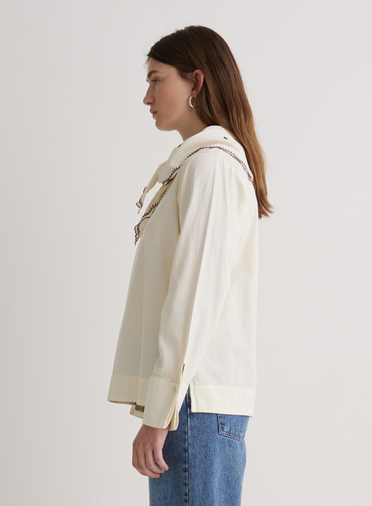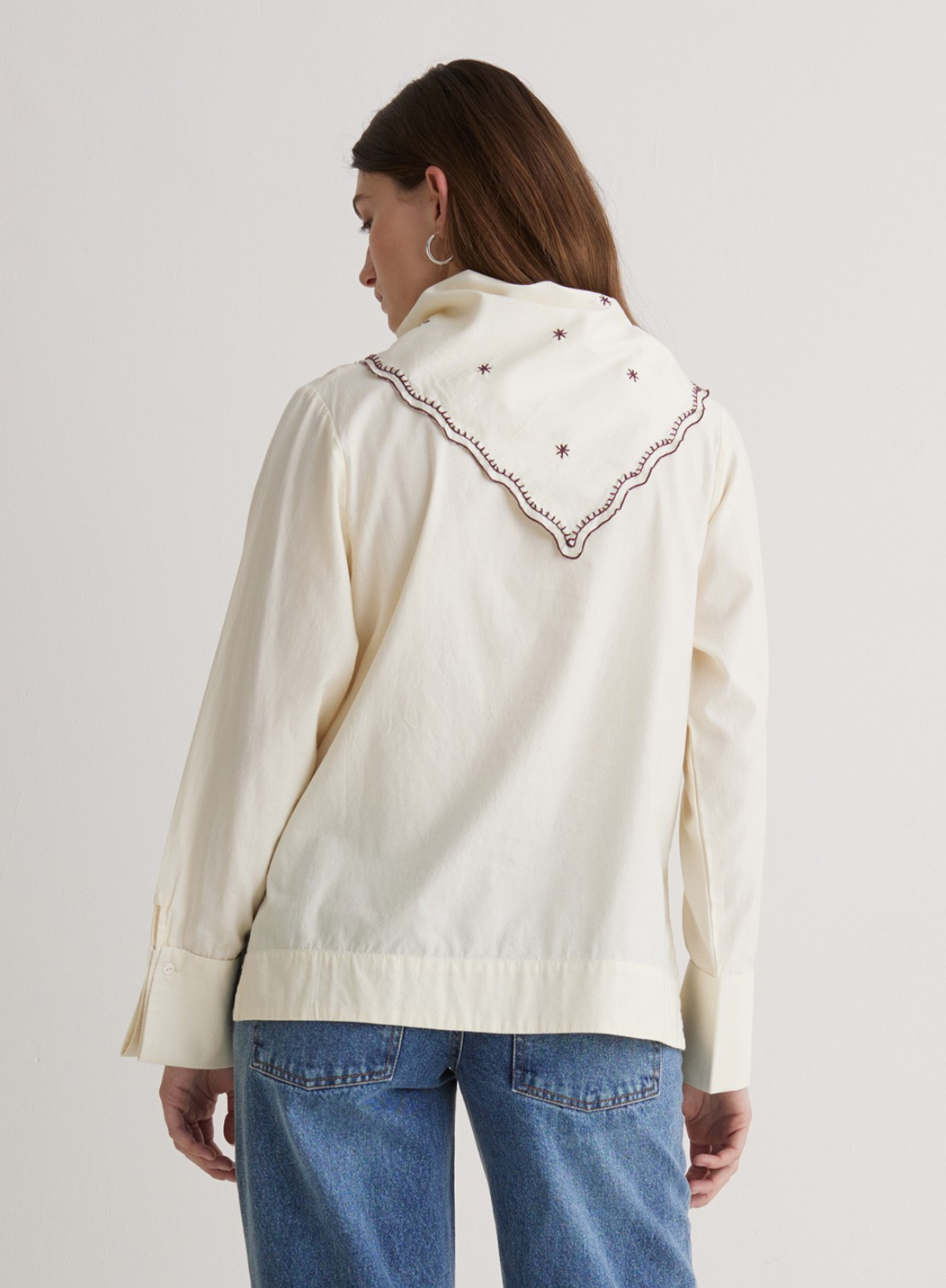 A removable embroidered scarf with buttons adds versatility and a unique detail, allowing you to adapt your look easily.