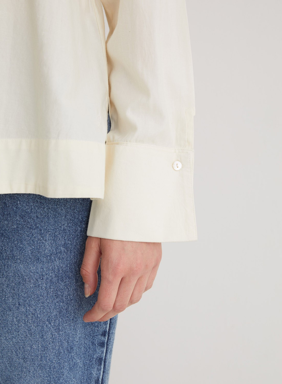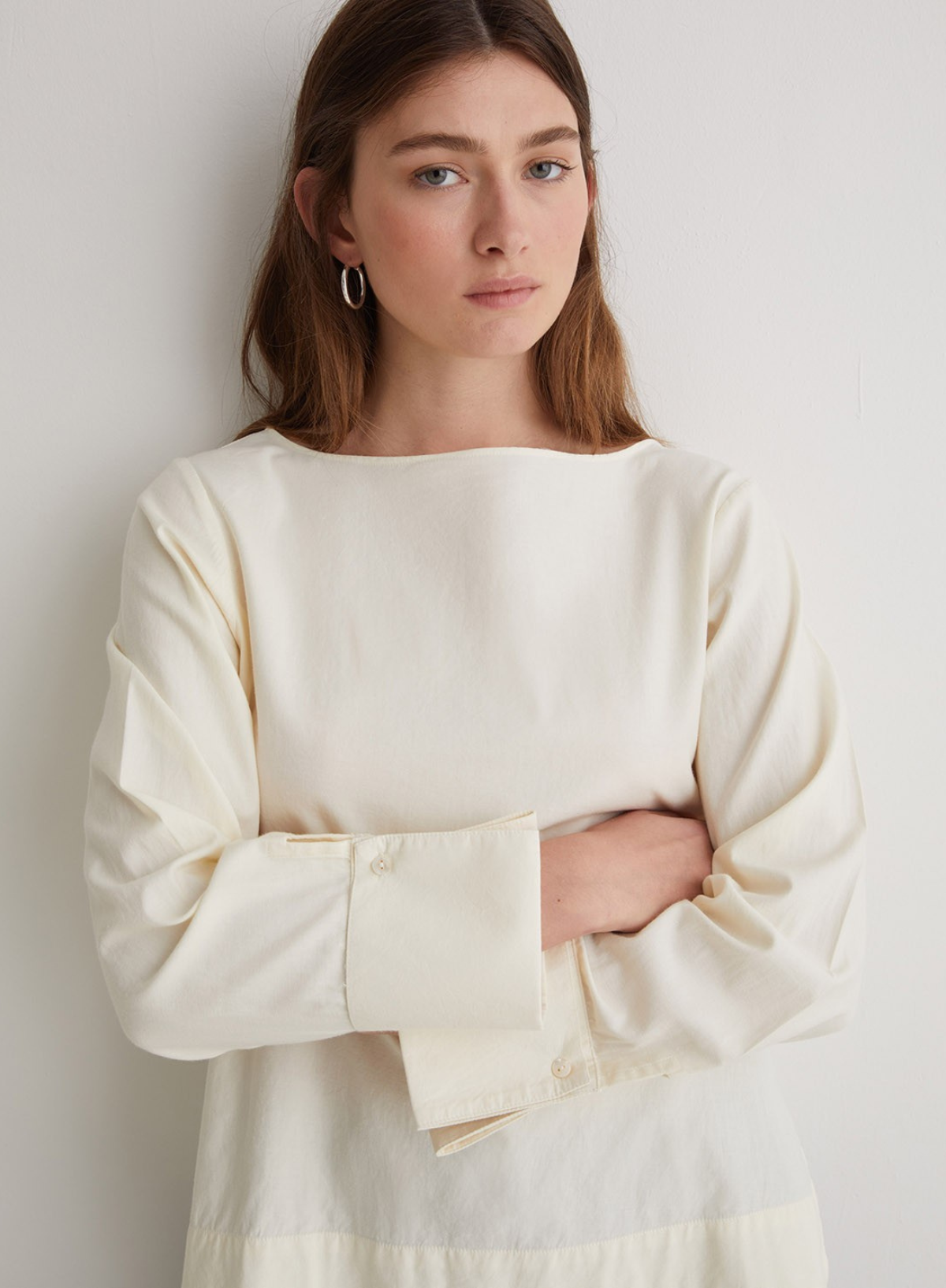 It features a wide cut and a bateau neck that offers a flattering, relaxed fit. The long sleeves end with buttoned cuffs for adjustable style and ease of wear.