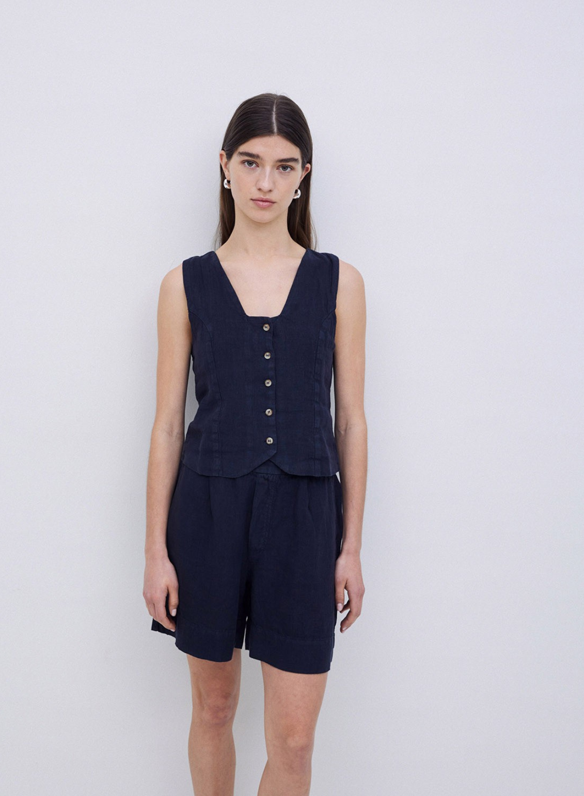 100% European Flax linen shorts. OEKO-TEX dye. Straight cut. Mid rise. No fastening. Elastic waist at the back. 2 side pockets.