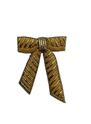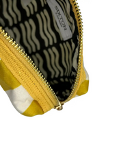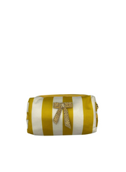 A gorgeous yellow and cream stripe velvet makeup bag, with a detachable Bow brooch.