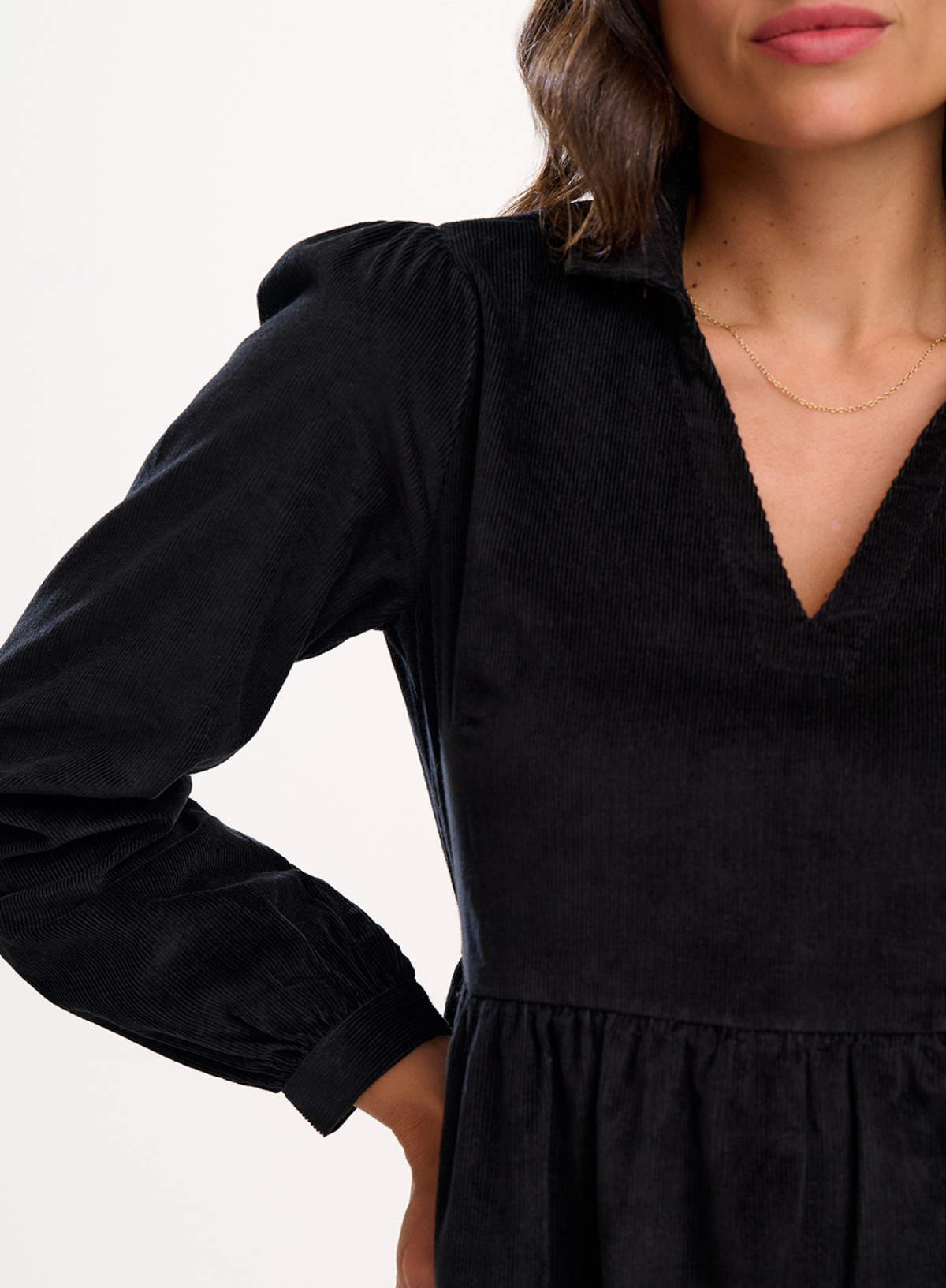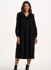 Meet your new throw-on-and-go favourite – the Adrianna Midi Smock Dress. Made from soft, 100% cotton cord in a rich black hue, it’s an effortless mix of comfort and style. With its relaxed smock silhouette, gathered waist, and flattering V-neckline, this midi brings easy elegance to cooler days.
