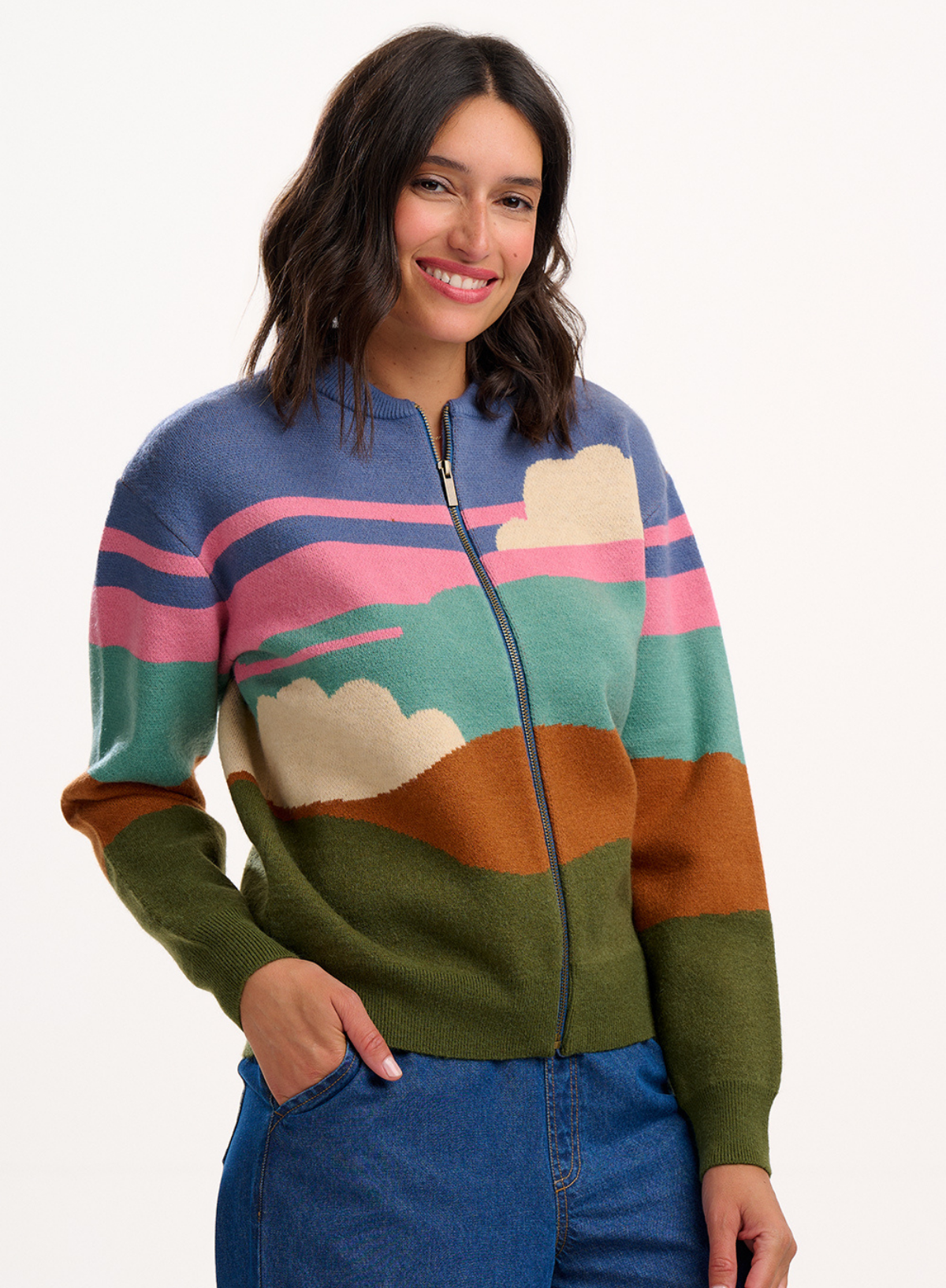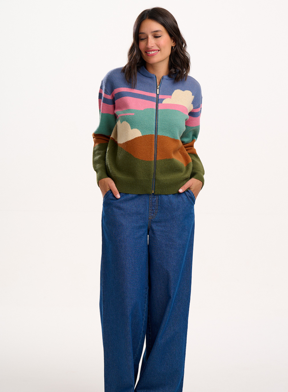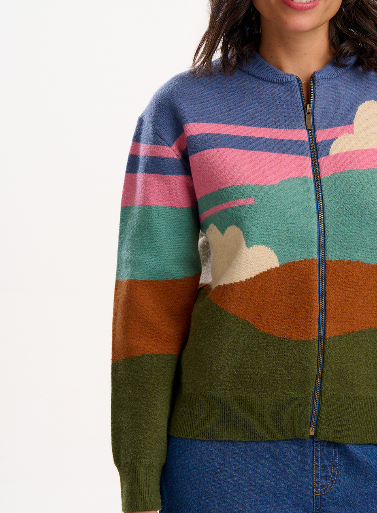 The all-over knitted design with multi-coloured hills and clouds, depicted in autumnal blue, turquoise, burnt orange, pink and green makes this knitted bomber a true statement piece that’s both cosy and stylish.