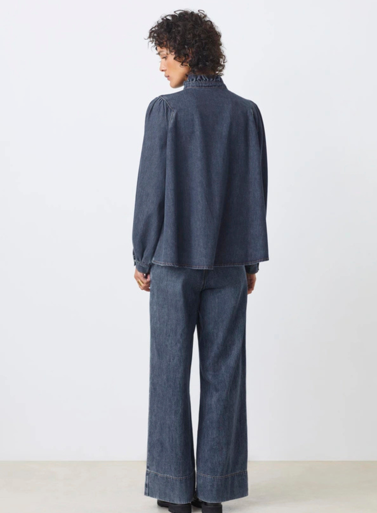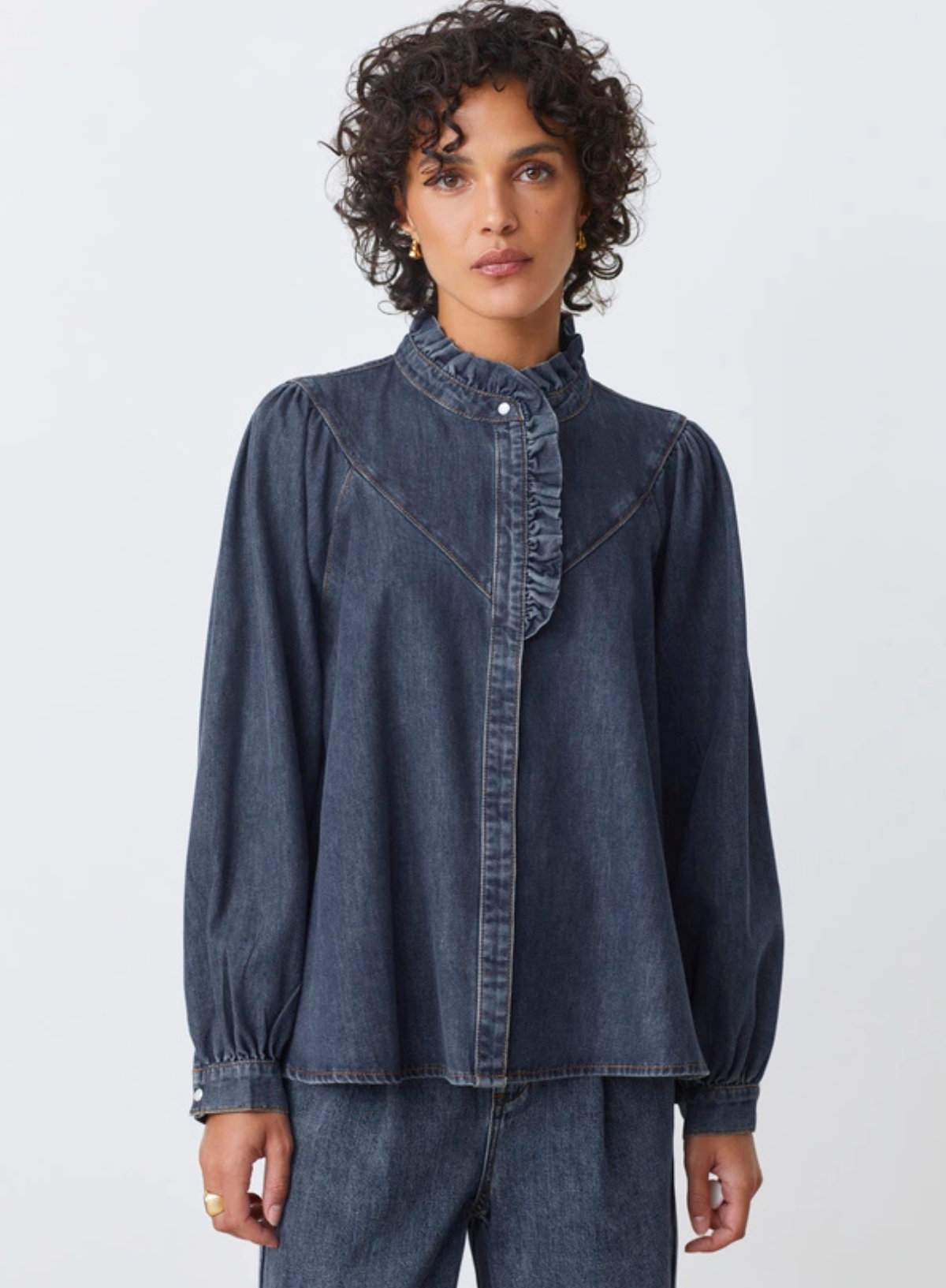 The Lively Shirt in Denim Blue from Suncoo combines classic denim style with delicate ruffled details for a refined look.