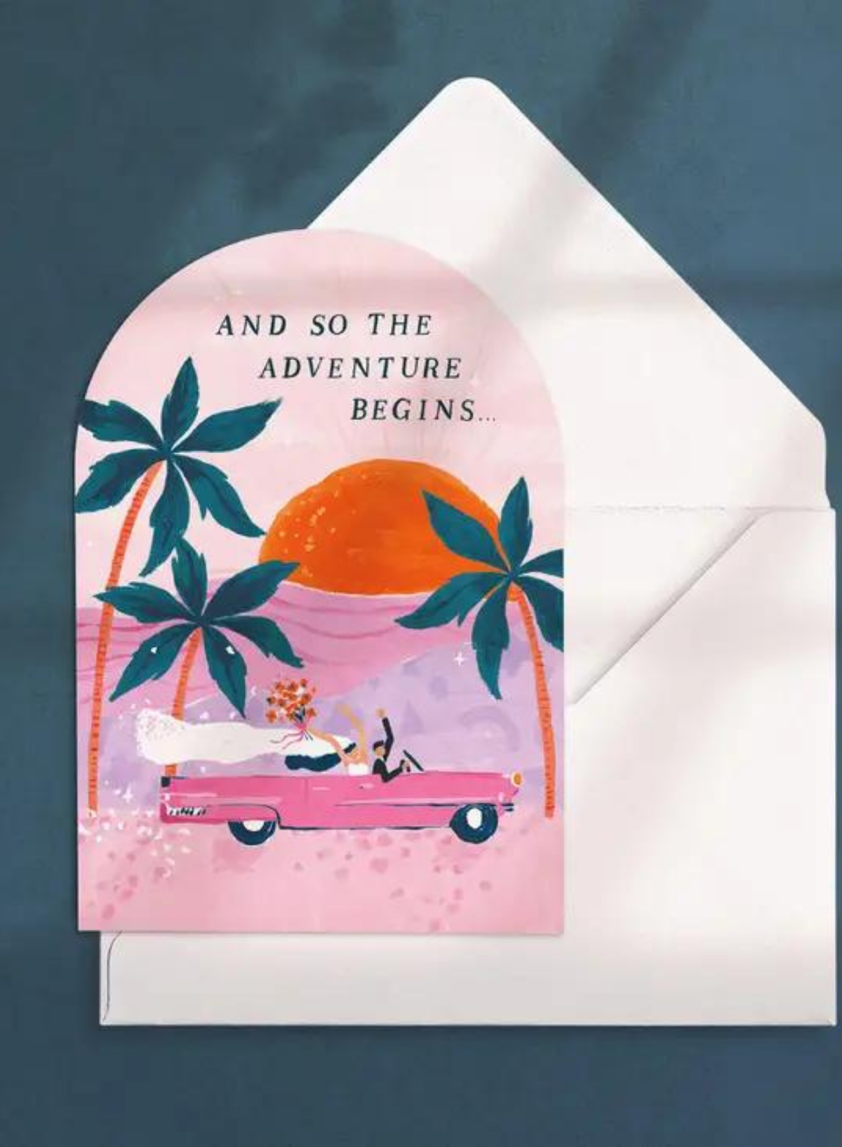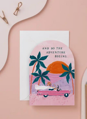 And so the adventure begins - A wedding card with an illustrated bride and groom in pink Cadillac driving off into the sunset.