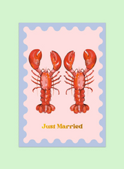 - Featuring a pair of illustrated lobsters, with a lilac wavey edge, pale pink background, and gold foil typography, this card is sure to make their day.
