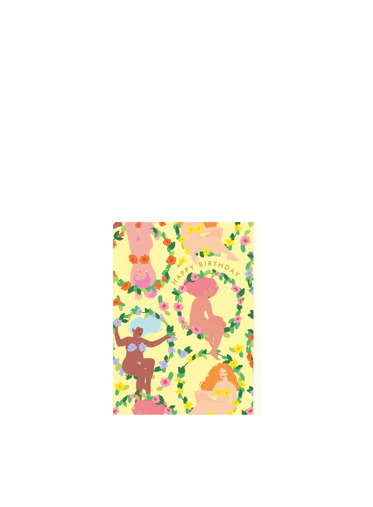 Celebrate in style with the Nudie Wreaths Birthday Card featuring charming illustrations of girls sitting on wreaths and a bold "Happy Birthday" gold foil message.