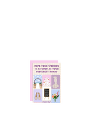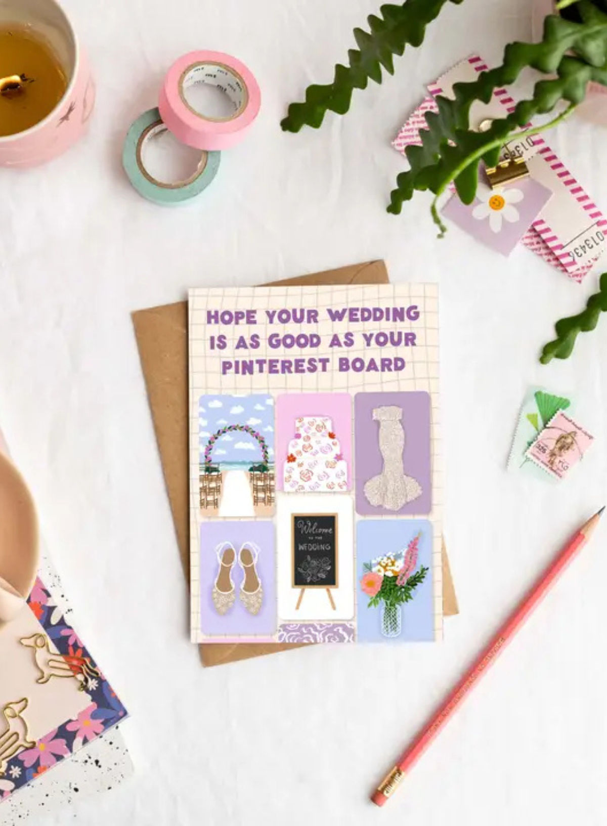 In a cutout-style font, the funny engagement card caption reads “Hope your wedding is as good as your Pinterest board”, a callout for that newly-engaged person who’s been collecting inspo for god knows how long.
