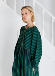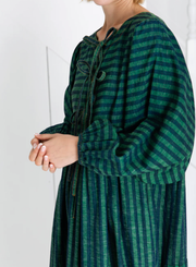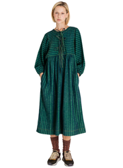 A loose and relaxed easy-fit organic cotton yarn dyed stripe dress with a statement bow fastening detail at the front and an empire line.