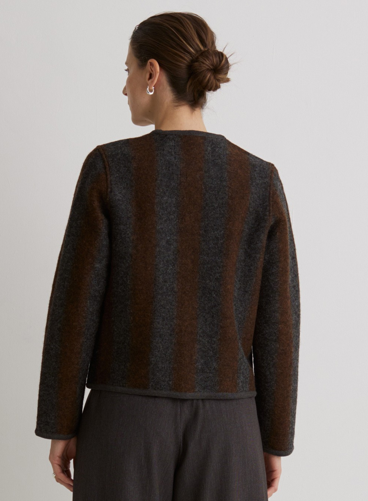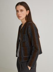 Short regular-fit jacket. Made of boiled wool. Striped print. Round neckline. Long sleeves. Button front. Contrasting accents. Two front patch pockets and 1 chest pocket.