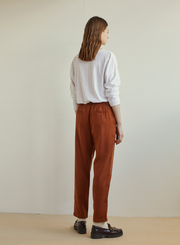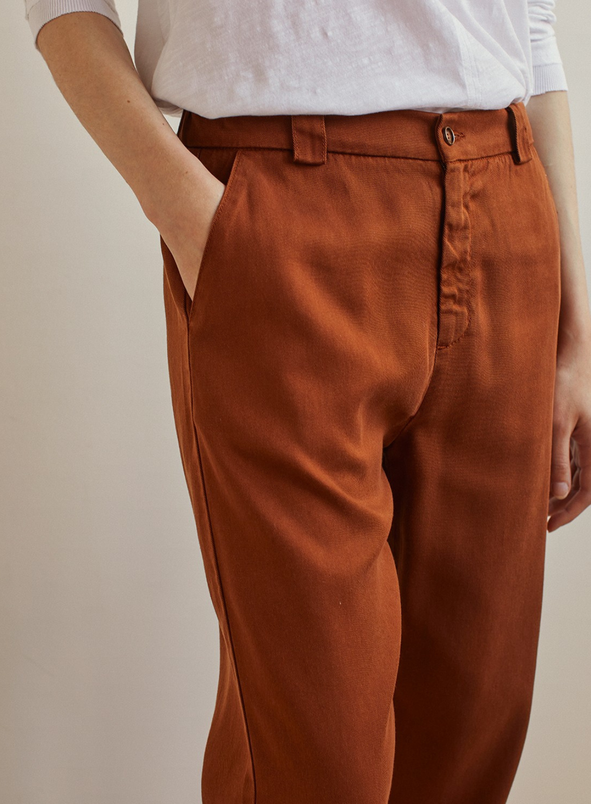 Tencel cotton trousers. Elastic waistband on back. Straight cut. Tencel fabric. Composition: 60% cotton, 37% lyocell, 3% elastane. Model is 175 cm tall wearing size M.