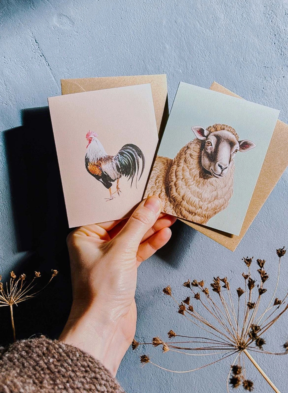 Printed locally on smooth, 300 gsm recycled paper, packed with a kraft envelope in a clear cello bag, card blank inside, printed in germany. 4.2" x 6".