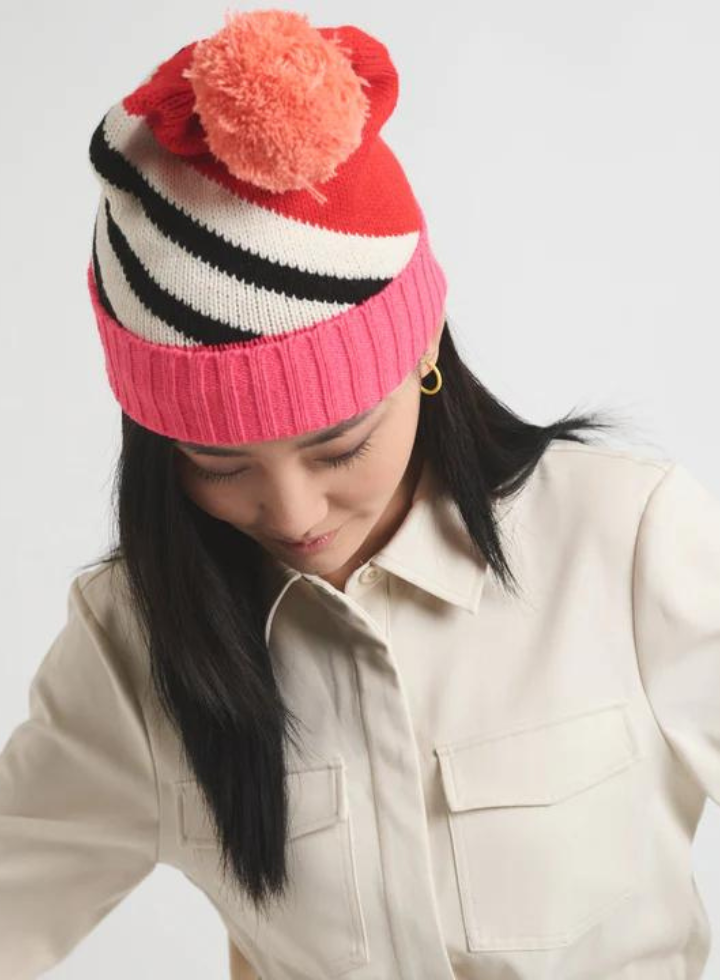 Cosy up in the Geo Beanie featuring bold monochrome stripes which cut asymmetrically across a coral background. Topped with a contrasting orange pom and finished with a coral turn-up rim.