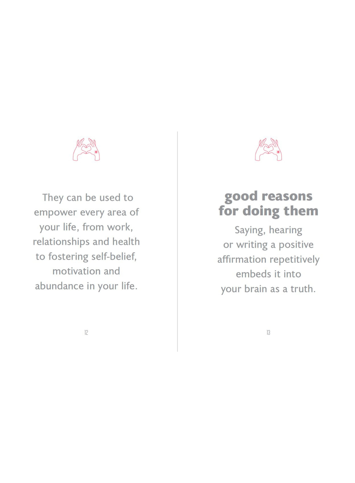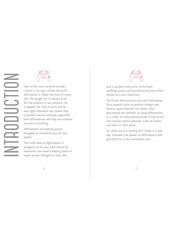 Harness the power of positive thinking with affirmations that you can use every day to attract health, healing, abundance and peace into your life. Based on the law of attraction that positive thoughts bring positive results, these affirmations will help balance your mind and body and help you face up to the challenges in your life. The book is organized thematically to cover categories such as love and relationships, growth and abundance, gratitude, confidence and self-esteem.