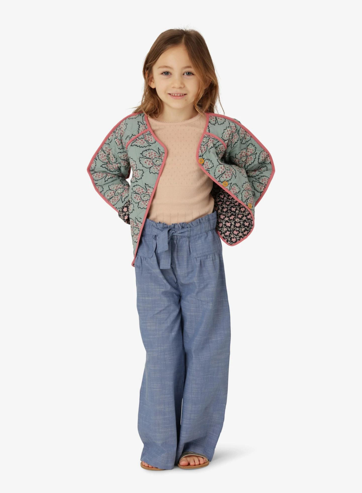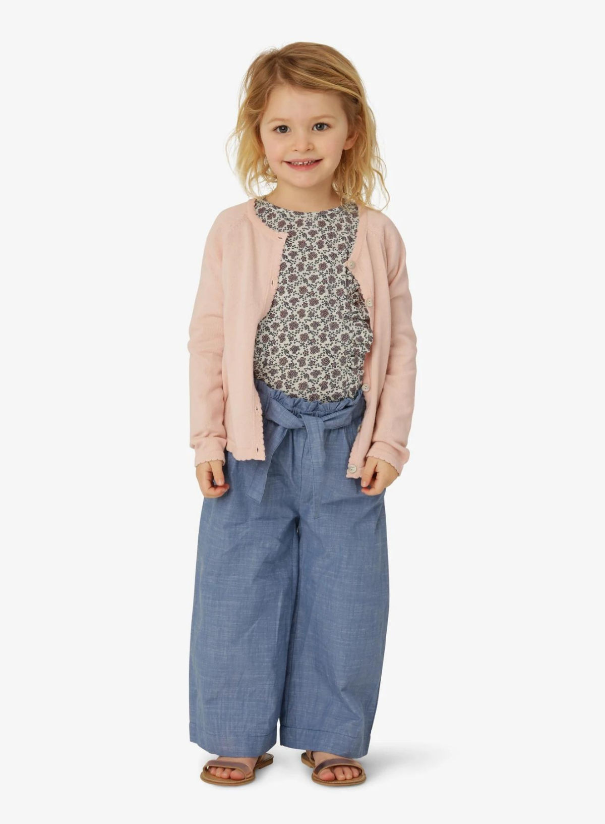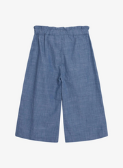 Wide-legged trousers in a light denim quality. The trousers have a tie-belt around the waist and a frilled, adjustable waistband.