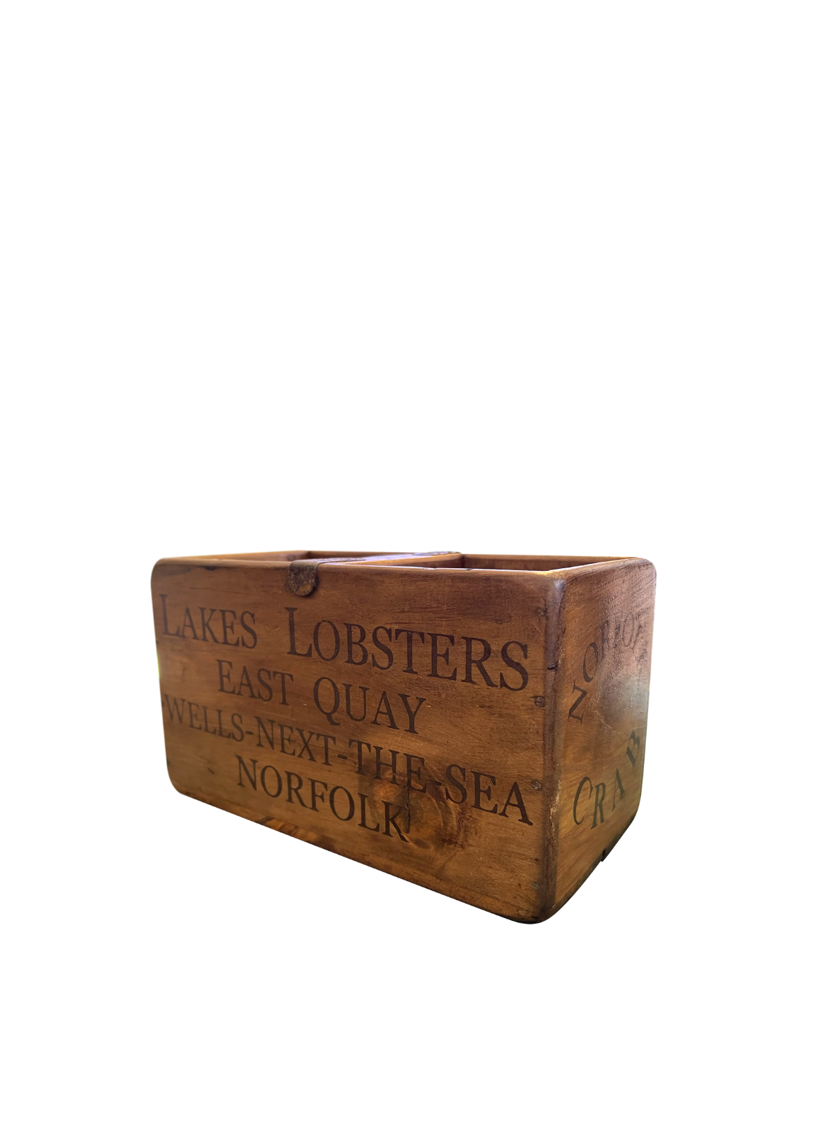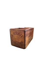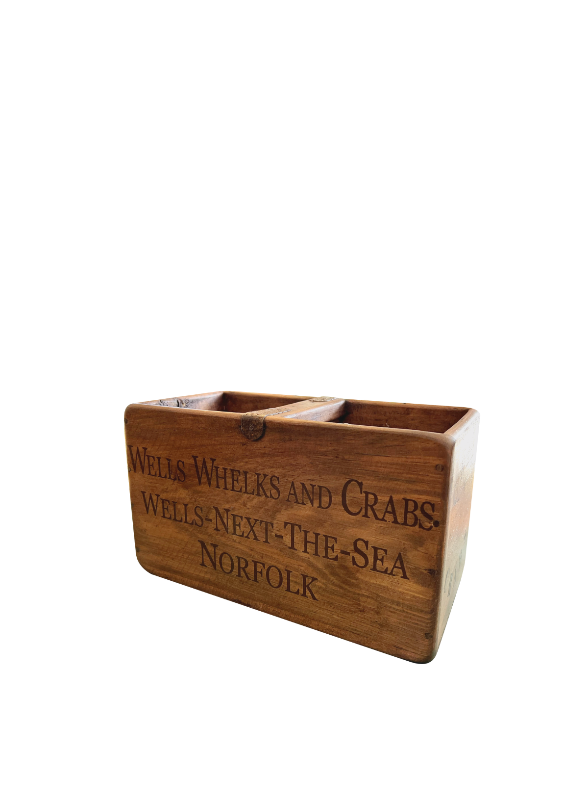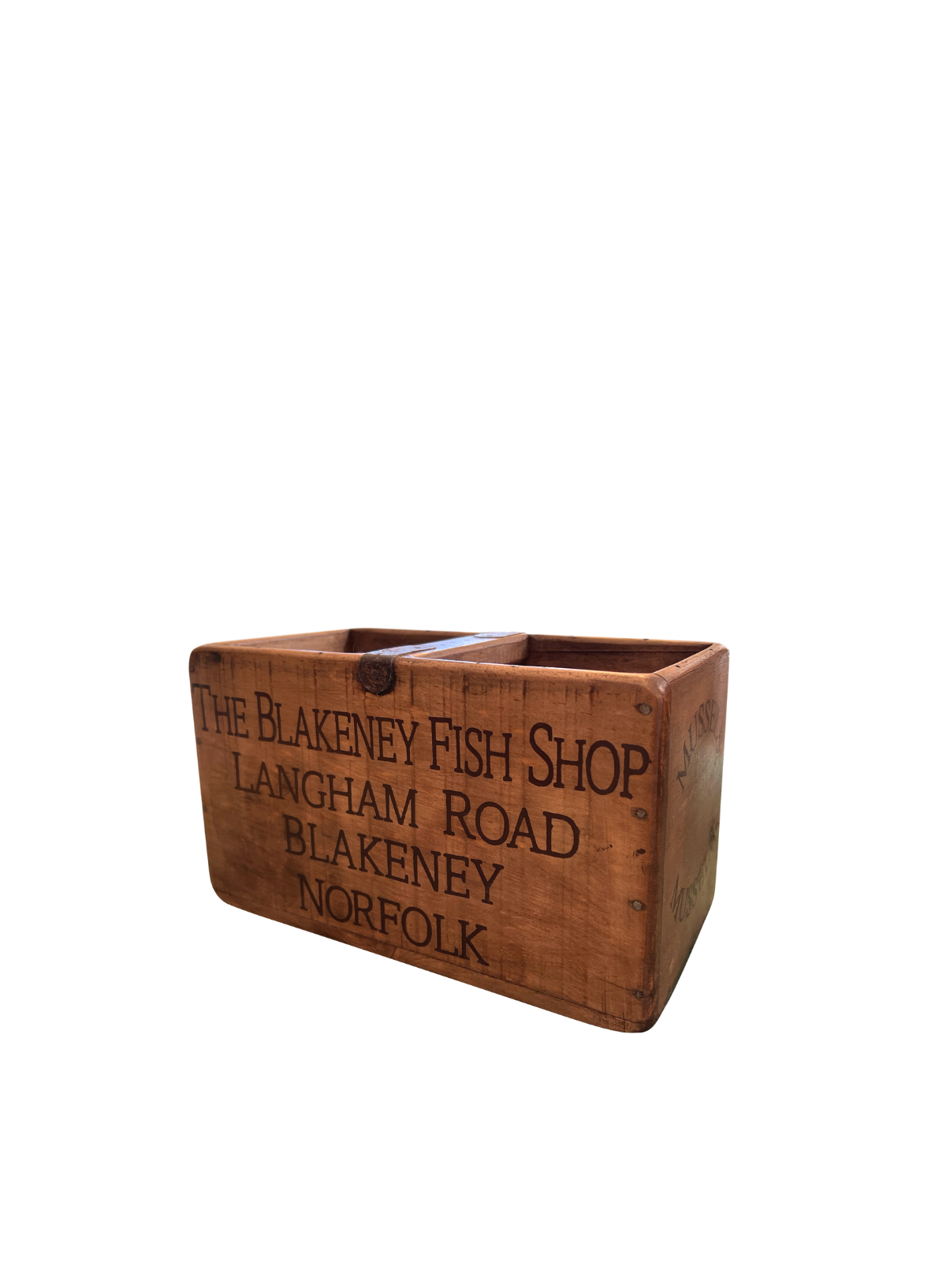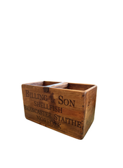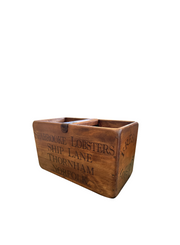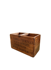 This medium-sized fish box is made from rustic wood and features a middle handle and two compartments