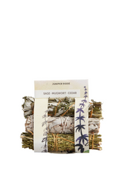 Juniper Ridge gathered three of the most beloved aromatic plants together–white sage, mugwort, and cedar–for our trio plant bundles. For each bundle, we’ve gathered together the leaves, rolled them into a bundle, and tied them with organic hemp twine.