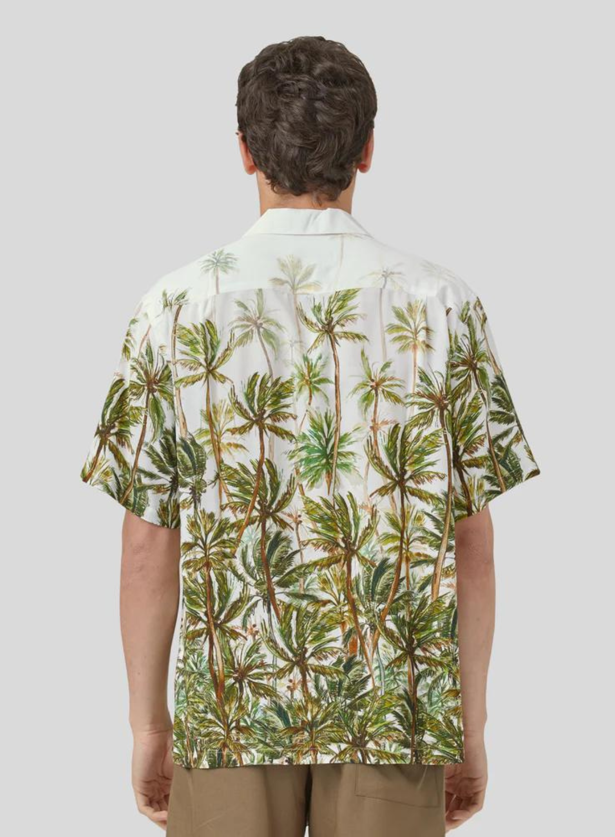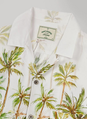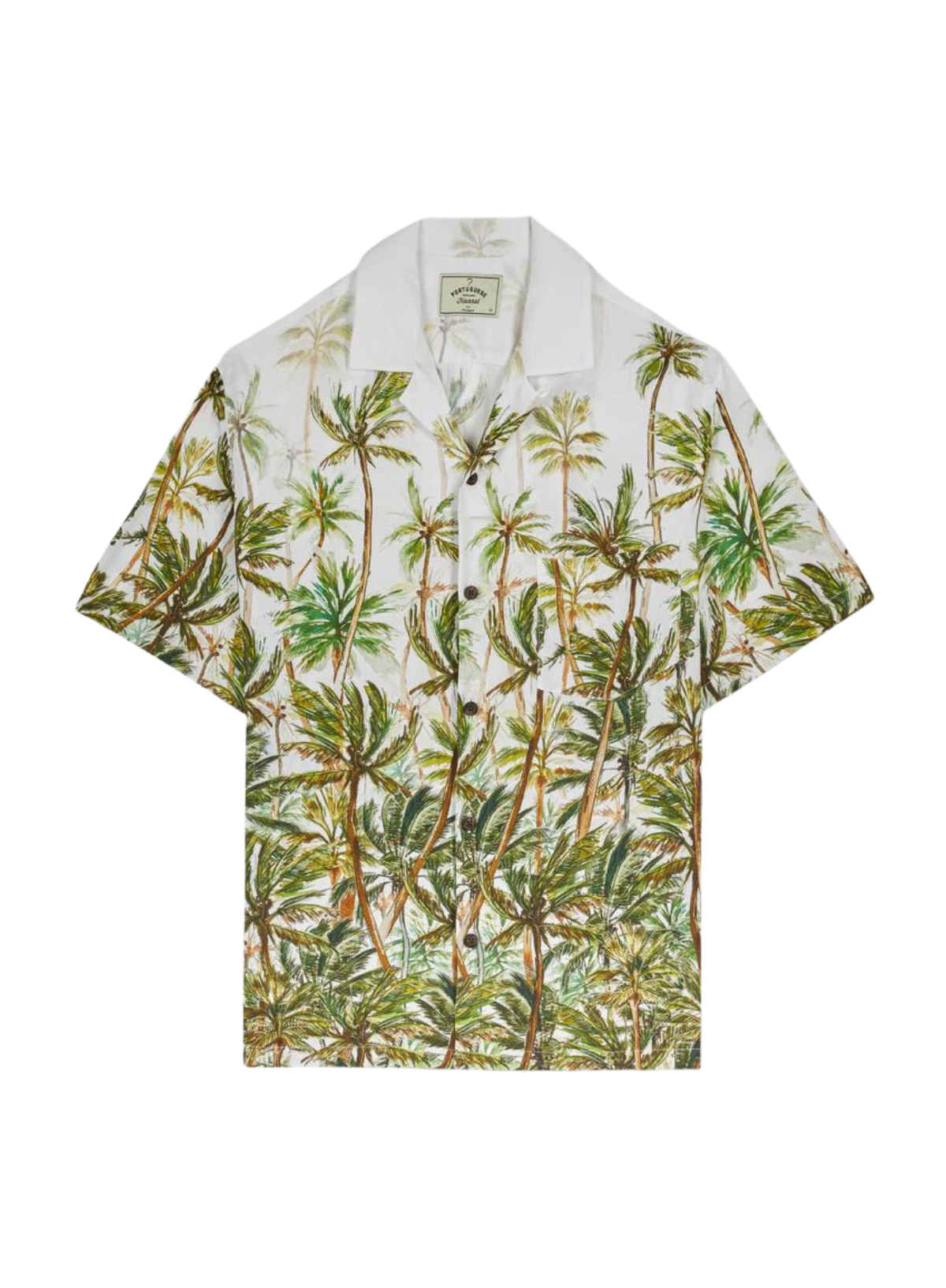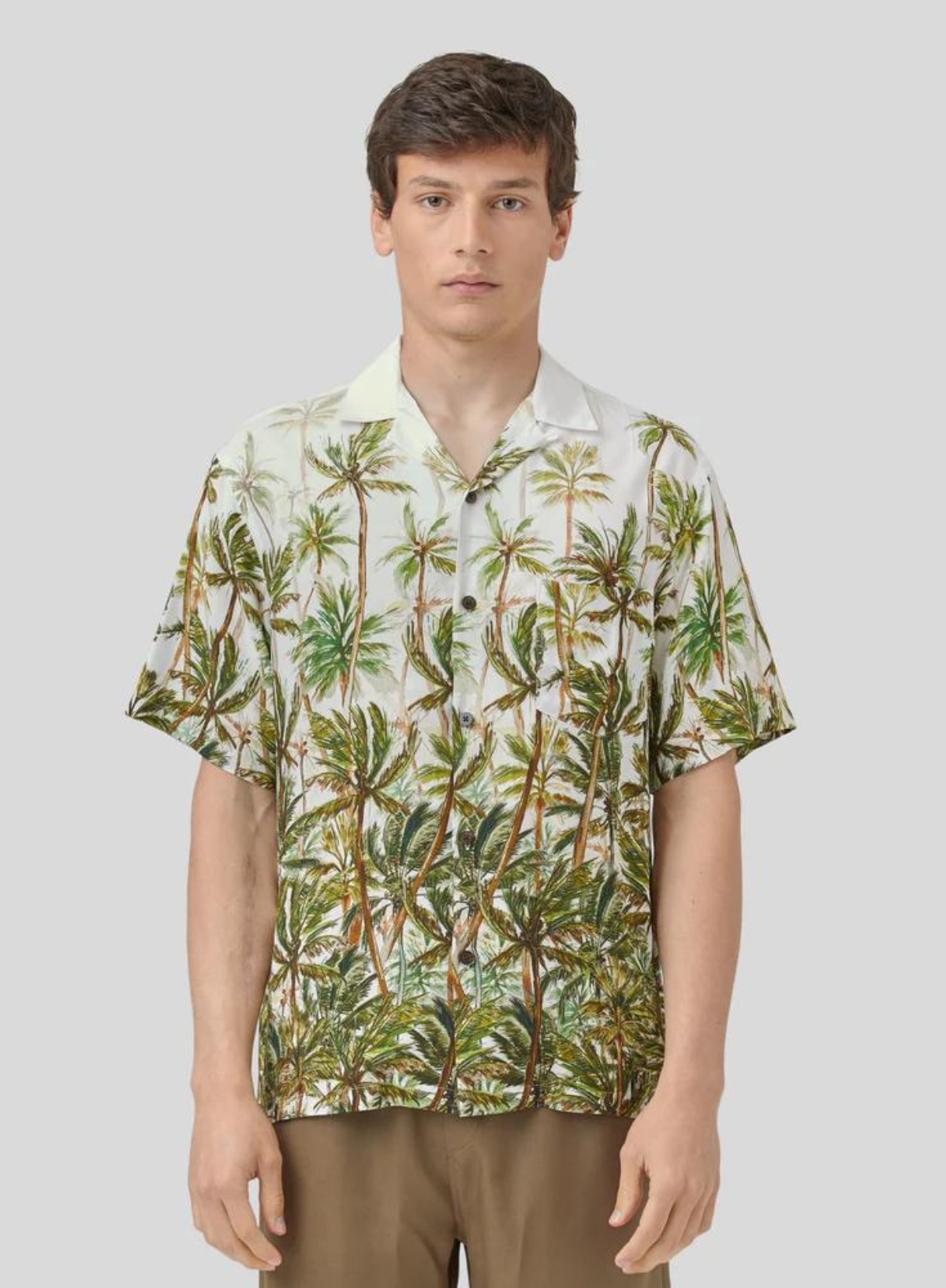 Short sleeve shirt with a palm print, a collar and buttoned front.