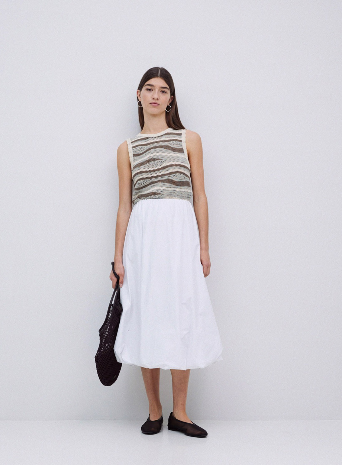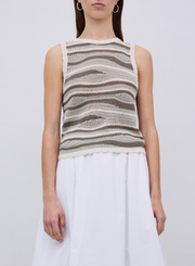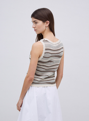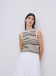 Sleeveless knit top. Cotton, linen and silk blend fabric. Straight cut. Round neckline.