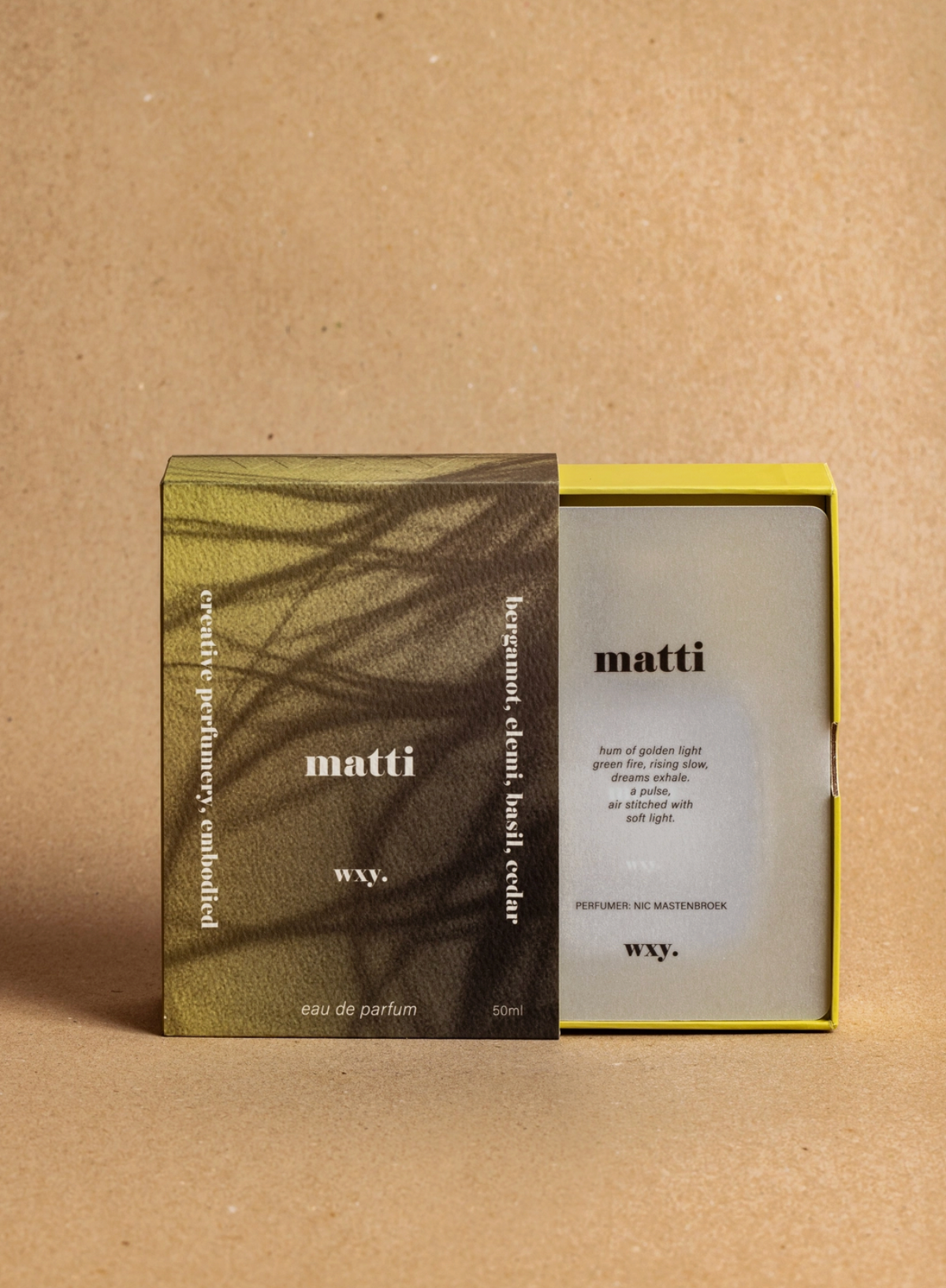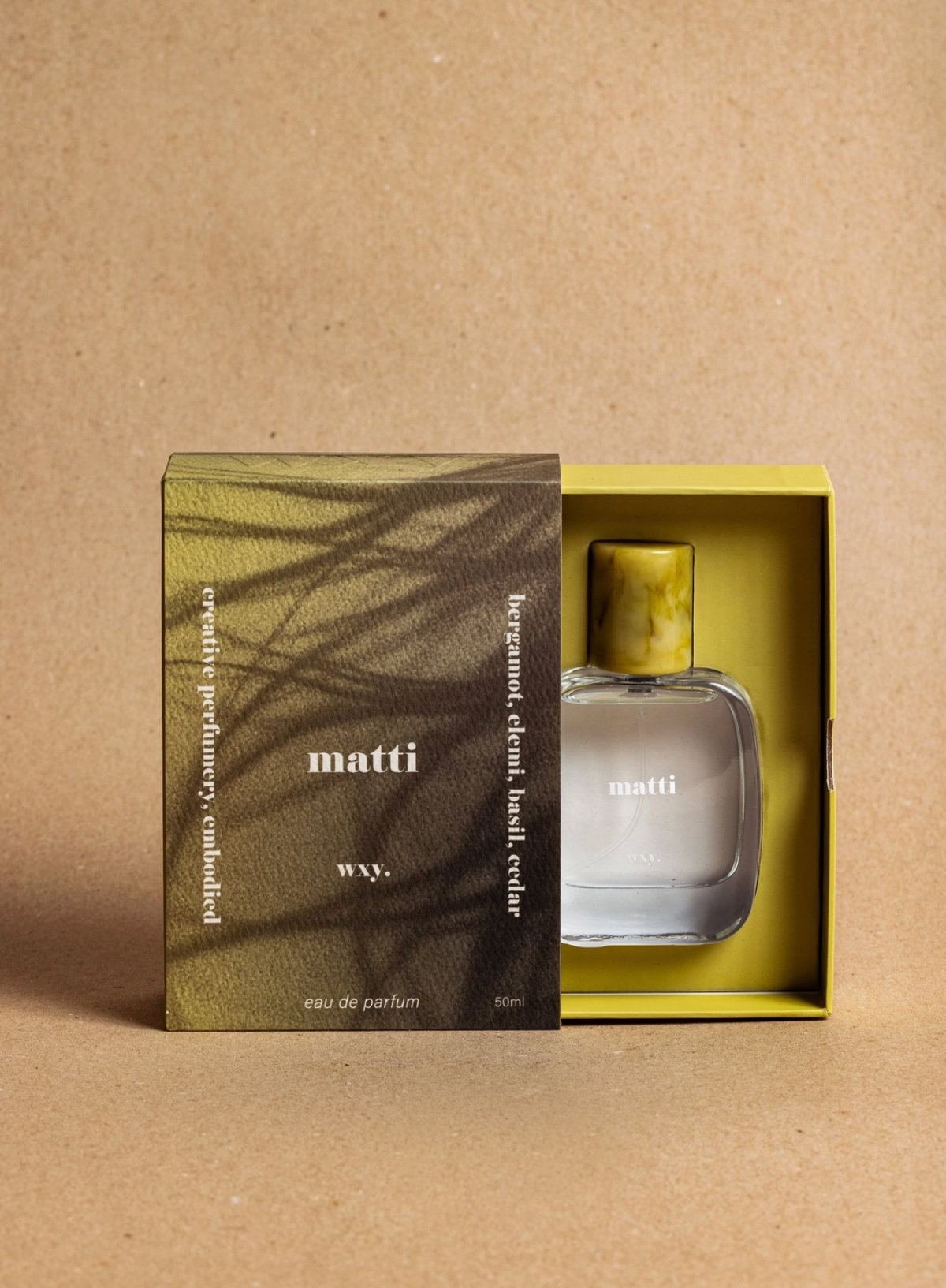 Matti delivers a burst of bergamot, juniper, and elemi with crisp, zesty sparks that feel instantly awakening. Then, the green juiciness of fig and basil takes over, cool and mouthwatering, like a splash of freshness on warm skin. A breath of dew runs through it, airy and bright. As it settles, cedar, olibanum, and labdanum roll in with a mellow warmth, grounding the fragrance in soft, woody depth. Matti glows with vibrant energy, wrapped in green freshness and anchored with a steady core.